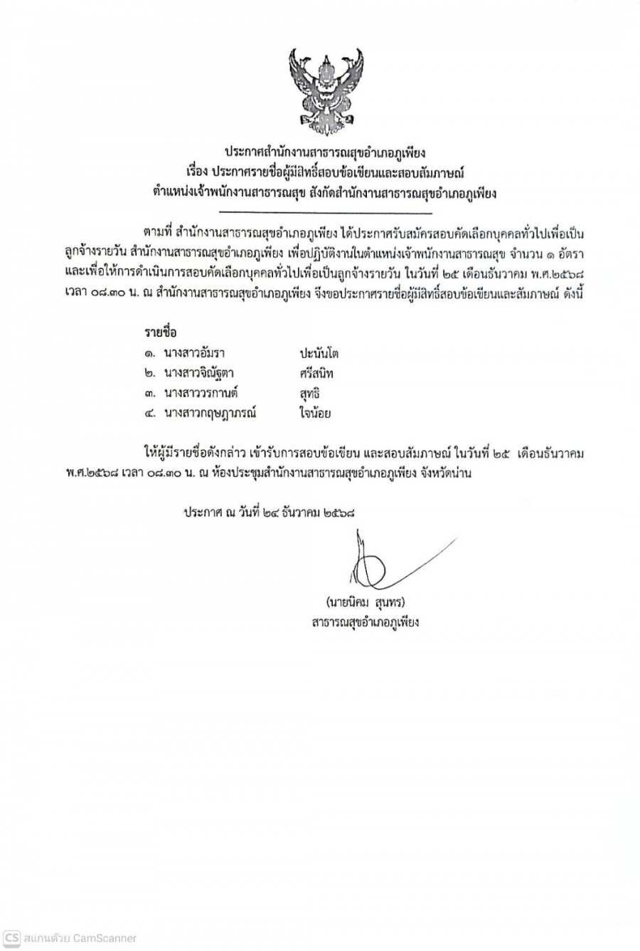 ประกาศรายชื่อผู้มีสิทธิสอบข้อเขียนและสัมภาษณ์ เจ้าพนักงานสาธารณสุข ในสังกัด สำนักงานสาธารณสุขอำเภอภูเพียง